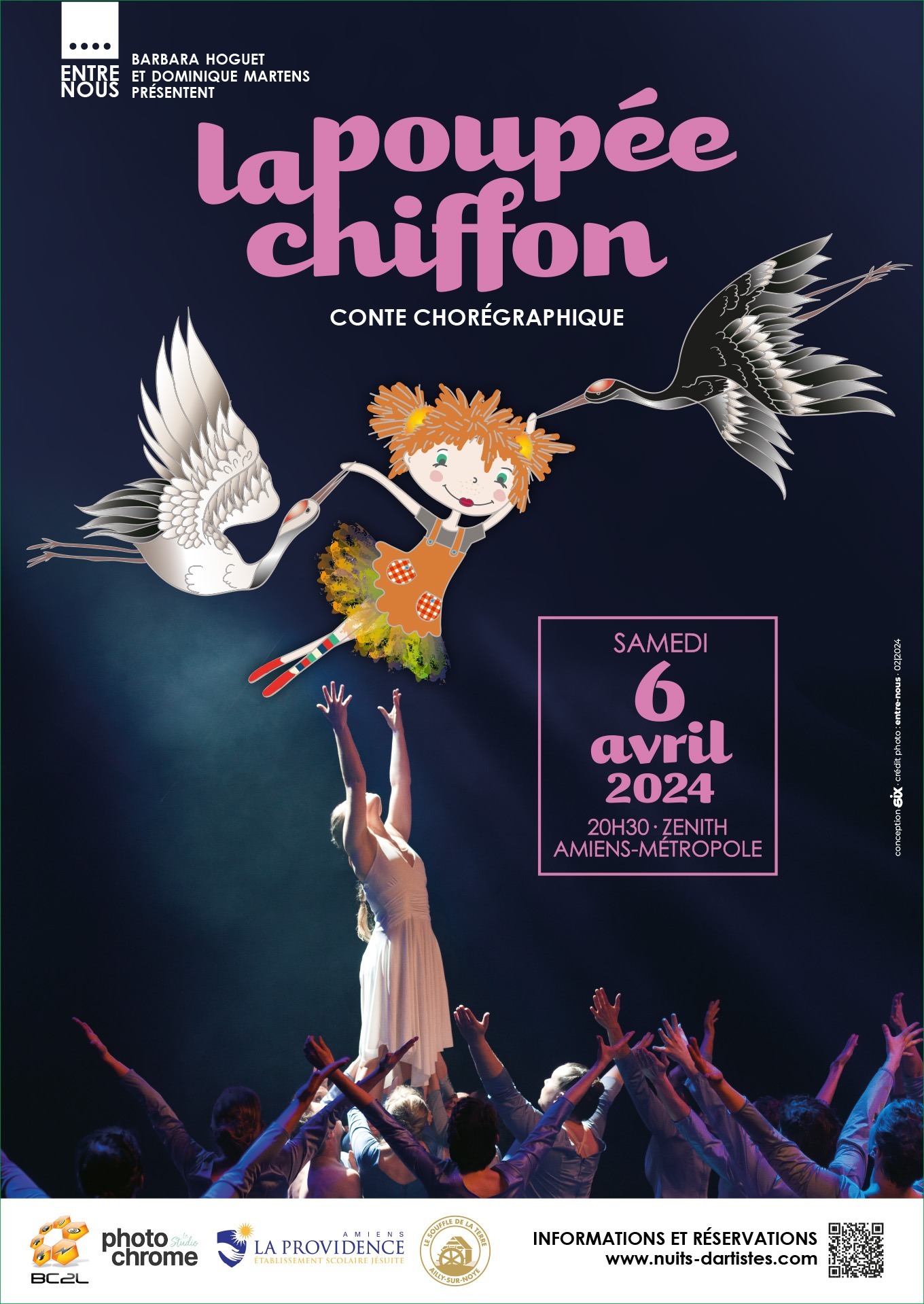 Découvrez « La Poupée de Chiffon », un spectacle de danse époustouflant produit par l’association Entre-Nous. Présenté au Zénith d’Amiens le 6 avril 2024, avec une mise en scène de Dominique Martens et des chorégraphies de Barbara Hoguet et Lauren Burosse. Ne manquez pas cette expérience unique !