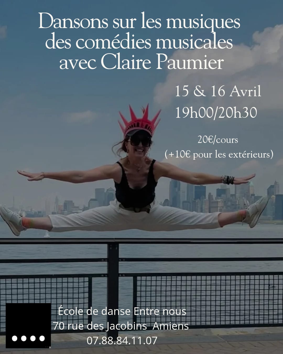» Dansons sur les musiques des comédies musicales » les 15 et 16 Avril de 19h00 à 20h30 avec Claire Paumier.Venez danser, vous éclater sur les musiques des comédies musicales. Ce stage est pour ados et adultes et sera un niveau moyen/intermédiaire. Réservations: https://www.helloasso.com/associations/entre-nous-amiens/evenements/dansons-sur-les-musiques-des-comedies-musicales